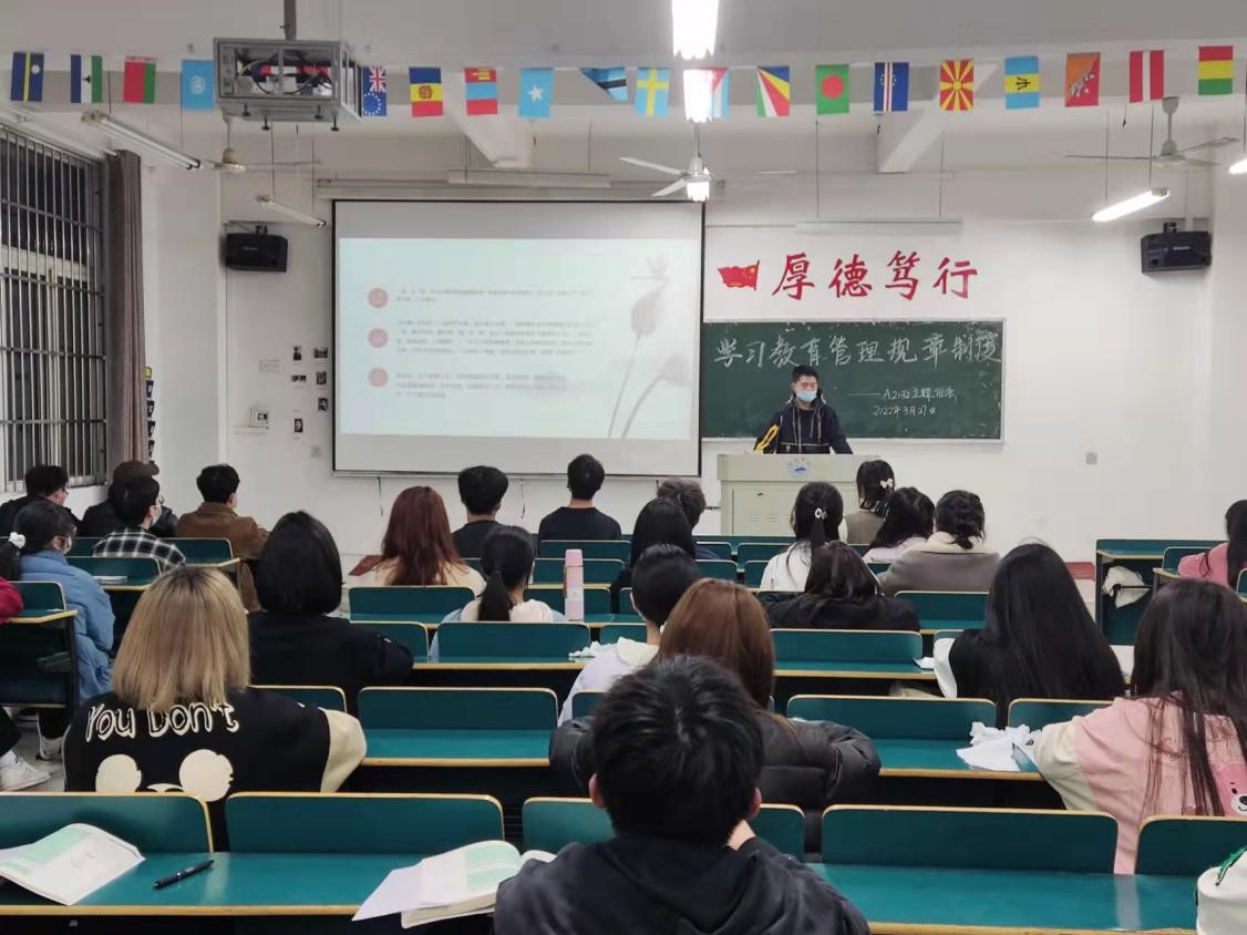 为进一步深入学习教育部教育管理规章制度,切实增强员工遵章守纪意识,3月21日晚,sunbet于义丰楼组织开展以“学习教育管理规章制度,增强遵章守纪意识”为主题的班会。本次班会由各班团支书主讲,sunbet全体学子参与。