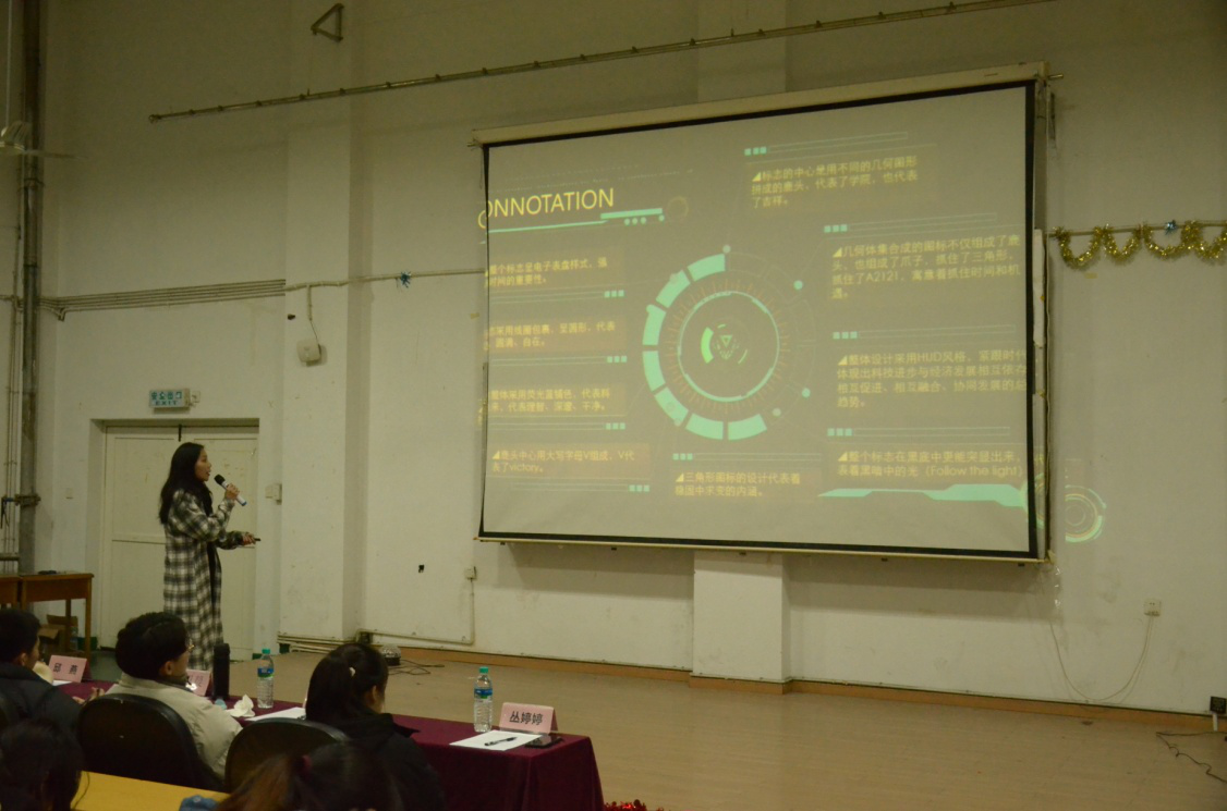 比赛开始前,老员工记者团志愿者绘制了宣传海报并张贴于义丰楼一楼大厅,全体志愿者也进行了下班宣传,以确保活动的顺利进行。各班积极踊跃报名,提交作品。评委通过初赛评审六个优秀班级进入决赛,评选结果于义丰楼一楼大厅张贴公示。在决赛中,各班的班长或同学代以PPT的形式向在场观众介绍了本班的班徽设计图纸,并讲解了构思过程、寓意等内容。评委根据各班的班徽设计理念、PPT制作及讲解表现进行了现场评审评分,并由院办公室的志愿者现场统计分数。接着,院办公室和老员工记者团志愿者带来了精彩的表演,现场气氛高涨,在场观众激情四射。最后,A2124班摘得桂冠,陈曦老师为其颁奖,并合影留念。