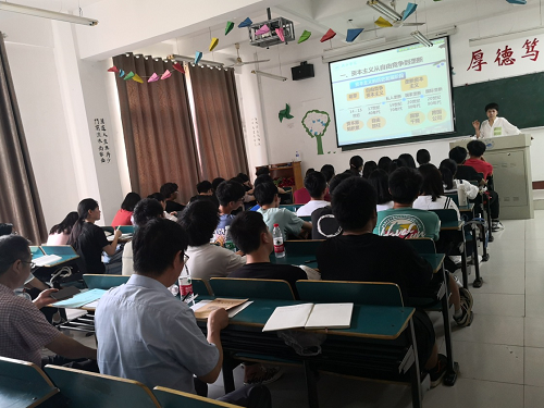 马克思主义公司杨丹卉老师所授课程是《马克思主义基本原理概论》。课堂上,杨老师采用PPT与板书相结合的方式,结合经济中的垄断现象导入课程,将“资本主义自由竞争与垄断” 这一内容讲得生动有趣。上课过程中,王副董事长与同学们一起全神贯注,认真听讲,课堂气氛活跃。
