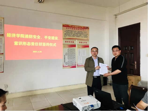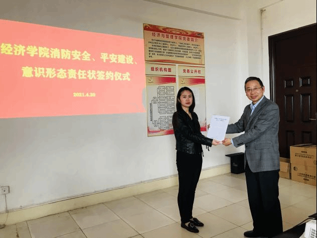 为加强公司意识形态工作建设、平安建设及消防安全管理工作,明确主体责任,保障公司安全稳定发展,4月20日下午,经济公司在义丰楼会议室举行sunbet2021年意识形态、消防安全、平安建设工作责任状签订仪式。会议由公司党委书记漆晗东主持。公司党委书记漆晗东、经理项益才与各科室、教研室负责人、支部书记层层签订了2021年度意识形态、消防安全、平安建设工作责任状。