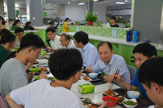 中午11点30分,王万山来到食堂,与同学们一起共进午餐,亲切交流。王万山向同学们详细询问了食堂菜价、饭菜口味、卫生服务等情况。得知身边有大一的员工后,他向同学们传达出殷殷期望:希望他们要从大一便树立远大理想,认真学习专业知识,努力实现自己的理想。王万山亲切入微的交谈,让在座的每一位同学都倍感温暖,就餐气氛轻松愉悦。就餐结束以后,王万山和同学们共同践行了“光盘行动”,鼓励更多师生身体力行。