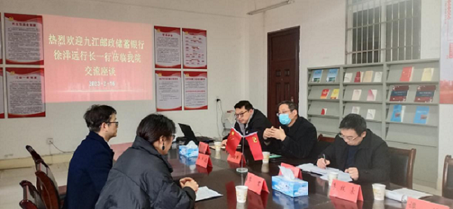 2月16日上午,中国邮政储蓄银行九江市分行党委书记、行长徐洋远,人力资源部总经理李君一行来院考察交流,公司党委书记漆晗东、副经理李华、金融学教研室主任李拔豪、员工科科长曹钧、就业专干谭梅参加座谈会。