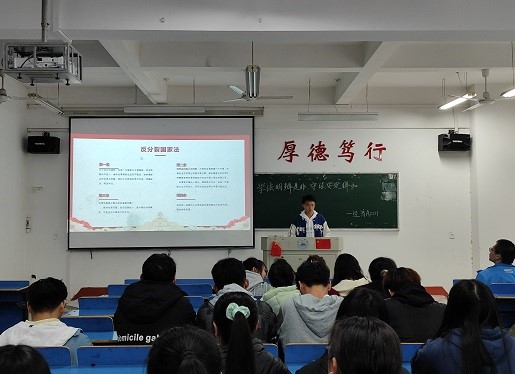 此次主题班会的开展,主要围绕四个部分讲述了“安全法治教育”,分别是反分裂国家法、网络安全法、反恐怖主义法、反有组织犯罪法。宣讲人首先以最近的现实案件为例,引入此次班会主题,随后带领同学们学习相关的法律知识,并针对身边发生的案例于同学们进行相关的讨论,提出同学们要增强国家意识和法治观念。
