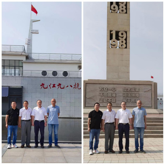 公司党委班子一行来到1998年长江九江大堤4-5号闸口间的决口处,一座矗立在广场中央高约20米、镂刻着“1998”的纪念碑映入眼帘,格外让人警醒。以当年堵口“功臣”---80米长的“甲21025” 号驳船为造型模型的纪念馆庄严肃穆。在纪念馆的北面是1998年被封堵的六十三米决口,伟大的抗洪精神——“万众一心、众志成城,不怕困难、顽强拼搏,坚韧不拔、敢于胜利”二十个大字定格在长江大堤上。