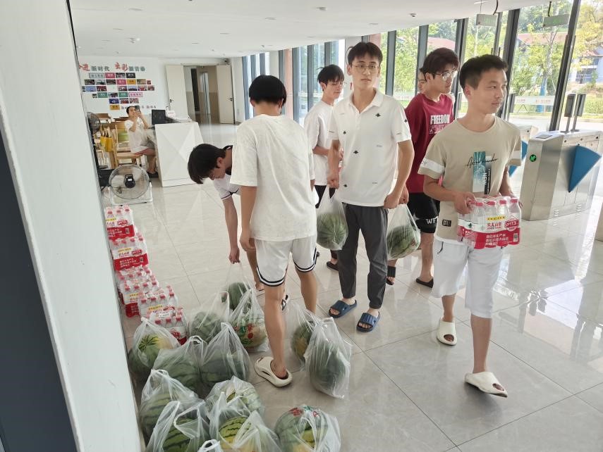 漆书记一行人先后来到员工宿舍和教学楼,与员工进行深入交流,了解大家平时的生活情况和学习状态,耐心倾听员工们对各类情况的诉求与建议。在提醒同学们做好防暑降温工作的同时,送来了清甜的西瓜和防暑降温大礼包。