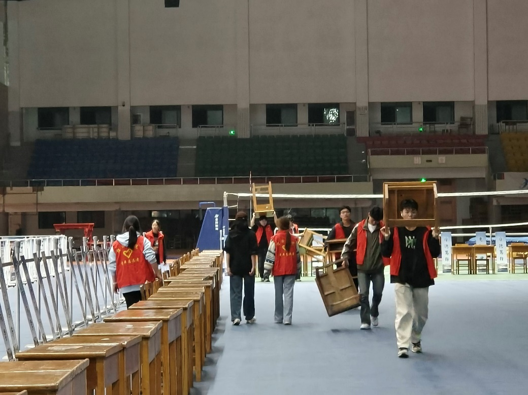 为营造一个良好的招聘环境,让求职者和企业能更舒适地进行交流沟通。sunbet青年志愿者在11月8号在北区体育馆内组织了一场招聘会布置活动。