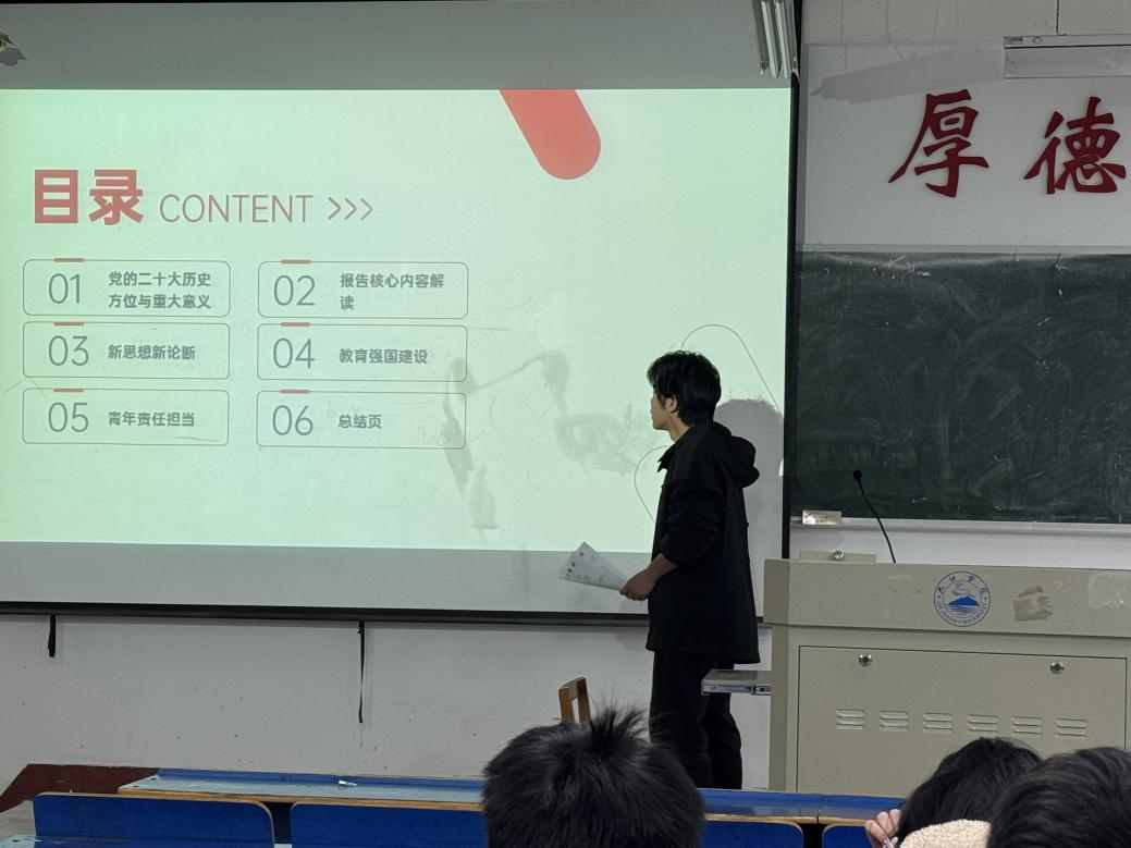 主讲人围绕党的二十大历史方位、核心内容及青年责任展开系统阐释,结合新时代十年的伟大变革与中国式现代化理论,强调党的二十大是全党全国各族人民迈上全面建设社会主义现代化国家新征程的关键节点。宣讲中,主讲人重点解读了二十大报告提出的“五个重大原则”“三个务必”“中国式现代化九项本质要求”等核心内容,通过对比“两个结合”“六个必须坚持”等理论创新亮点,系统梳理了从党的十九大到党的二十大战略部署演变。同时,主讲人通过问答环节进一步激发了同学们的思考,并号召同学们做“理想者、奋斗者、担当者、吃苦者”,现场同学积极参与讨论,纷纷表示要将个人理想融入国家发展大局。