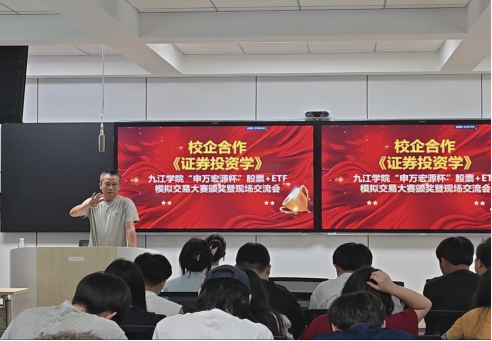 在模拟交易大赛颁奖暨现场交流会上,申万宏源九江分公司负责人介绍本次产教融合模拟交易大赛的意义,宣布了获奖人员名单并现场颁发了奖状和奖品;获奖同学代表作了交流汇报,他的汇报感悟获得了在场同学们阵阵掌声;张可斐老师以《交易之道》为题,围绕“交易的误区与心态管理”展开了深入浅出的分析,让同学们深深感到受益匪浅。