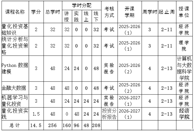 跨学科融合:结合金融学、投资学、数学、统计学和计算机科学,培养具备“金融+数学统计+编程”能力的复合型人才。