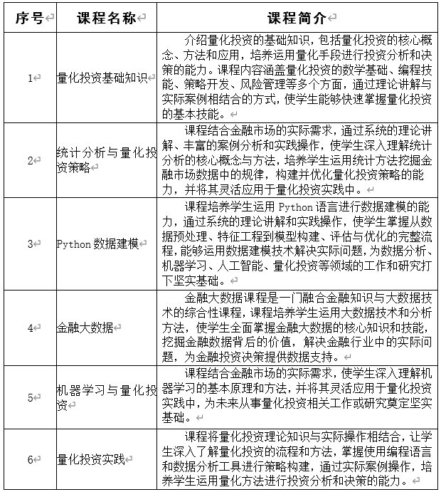本专业涵盖了金融市场基本理论、数据分析与建模、金融产品定价、投资组合优化、风险管理和金融工程等多个领域,课程包括:量化投资基础知识、统计分析与量化投资策略、Python数据建模、金融大数据、机器学习与量化投资、量化投资实践共6门课程。课程注重理论与实践的结合,员工需修完13个学分。