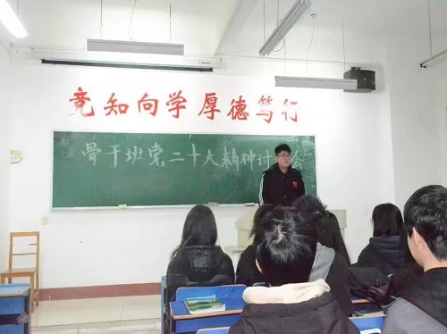 活动中,许学航带领骨干班同学们重温了伟大建党精神、历史自觉、主动精神和钉钉子精神等九个在党的二十大中所提到的精神,同学们专心听讲,认真记录。许学航主要是从数字视角学习党的二十大精神,包含数说之“一”:统一,数说之“二”:第二个百年奋斗目标、第二个答案、两步走等一系列内容。最后,同学们表示作为新时代青年,我们要牢记空谈误国、实干兴邦,坚定信心、奋勇前进。