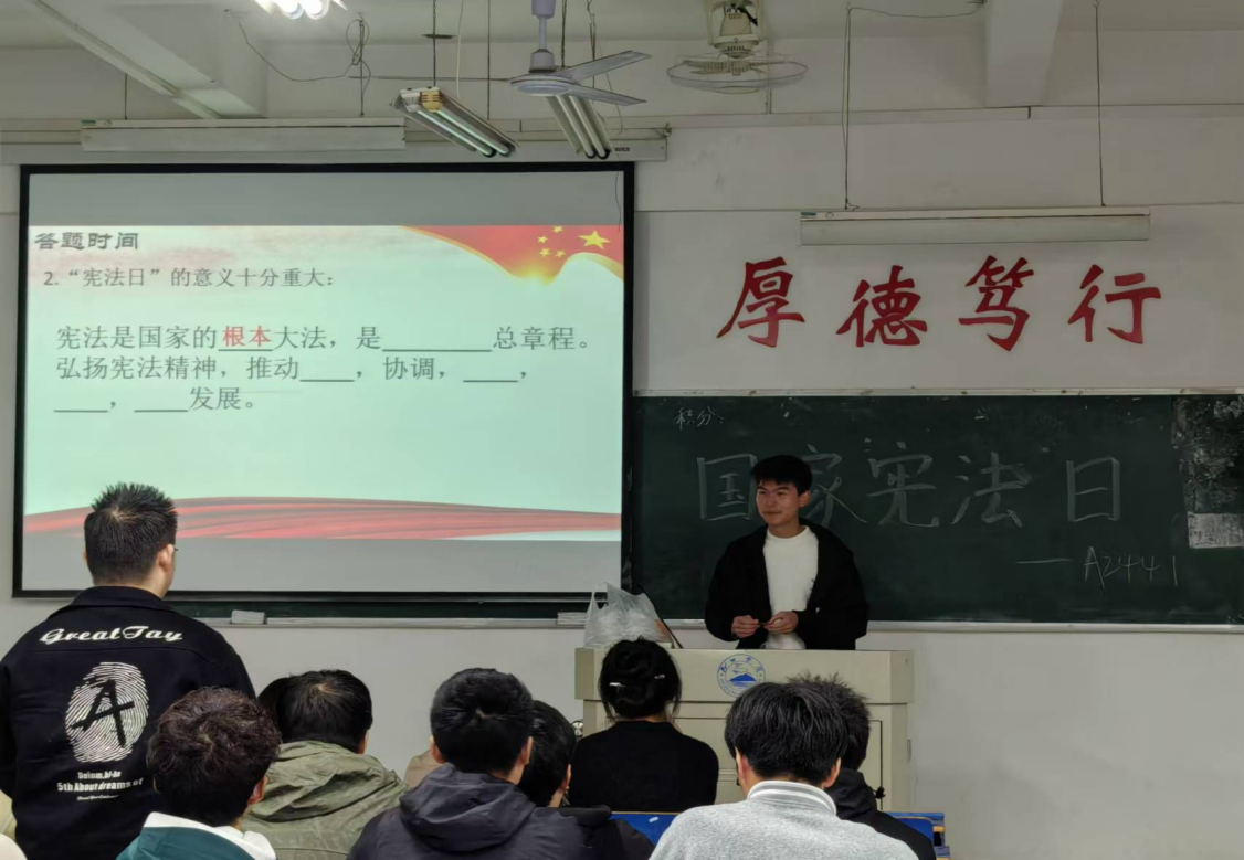 为增强同学们的宪法意识,大力弘扬宪法精神,营造尊崇宪法、学习宪法、维护宪法、践行宪法的浓厚氛围。12月1日,sunbet特在义丰楼开展以“弘扬宪法精神,共筑法制青春”为主题的团日活动。