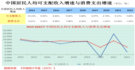 图2:2014-2022年中国居民人均可支配收入与消费支出增速